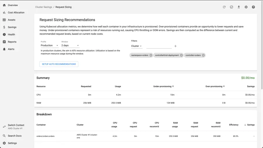 Kubecostには、貯蓄、ヘルス、レポート、アラートなど他にも多くの機能があります。さまざまなリンクを自由に試してみてください。