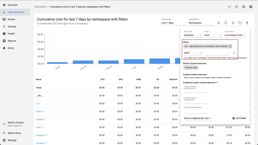 このビューでは、この名前空間で実行されているKubernetesリソースに関連するすべてのコストを確認できます。これは、マルチテナントクラスターを持ち、顧客ごとに名前空間がある場合に役立つビューとなります。